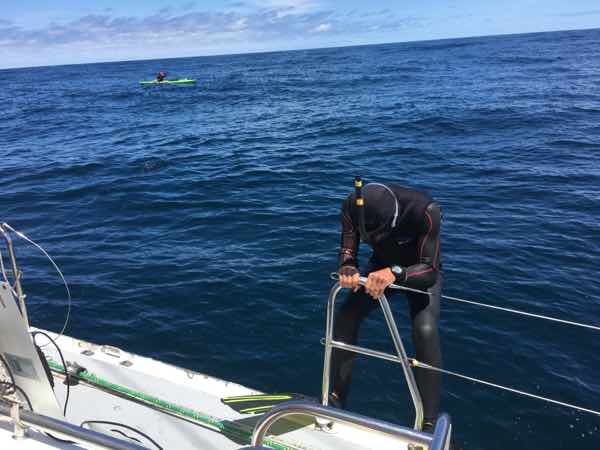 I was back being paced by the RHIB with Jo and Maks, the problem had been solved, our two batteries were fully charged. It was an uneventful day, no dolphins, no ships just a lonely fish that decided to swim right below me for the last 3 hours.