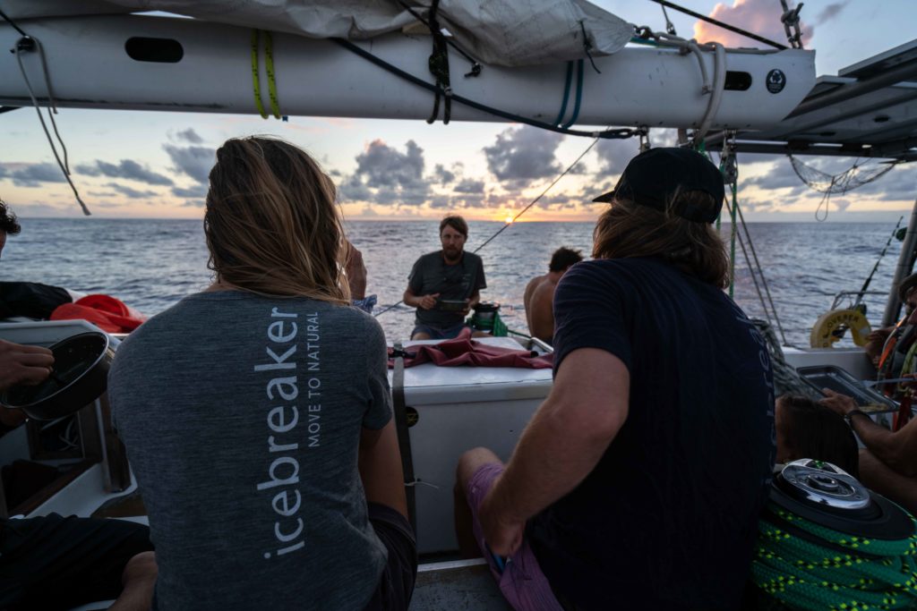 The team had prepared a memorable evening to honor me making my 300 nautical mile mark. Heather cooked an amazing dinner, she even prepared a sugarless dessert for me. After our daily meeting on deck, Corbin and Adam secured a white canvas and a projector on the helm guard, and we all gathered in the cockpit to watch a movie: outdoor theater in the middle of the Pacific!